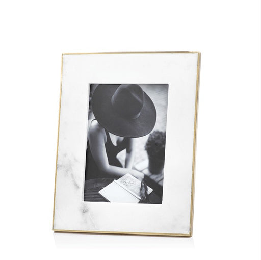 BDC Livingfrom BS$91.80Product Description: White marble frame features matt gold brass edge and holds a photo inserted through back of frame. Stands with easel.